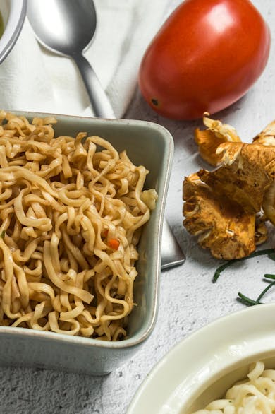 Gruby makaron pszenny udon smażony z wybranym dodatkiem, czerwoną i żółtą słodką papryką, marchewką oraz porem.